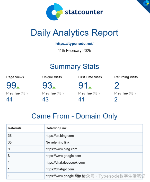 这篇文章没有实质内容,发就是图一乐。我的个人博客网站typenode.net,里面有不少我之前的文章,当然,自从在公众号上面写东西后,就懒得去更新网站了。我用的是StatCounter这个统计服务,每天会向我的邮箱发送日访问统计报告。