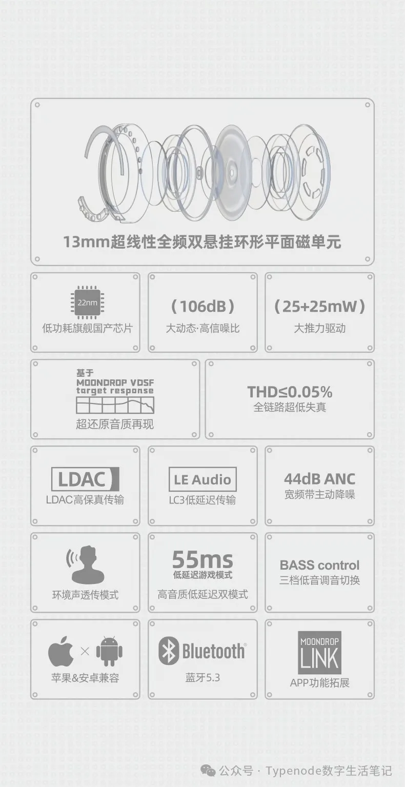 挑重点,梦回没有选择高端的芯片,但是性能还是相当不错,支持LDAC和最新的LC3编码技术,不是高通的芯片所以不支持aptX,不过当下的很多手机应该都支持LDAC,至少,AAC还是绝大部分蓝牙设备都支持吧。对于蓝牙耳机来说,耳机本身的硬件素质对音质的影响远编码带来的影响,只要保证是AAC以上就足以满足需求。当然,如果耳机本身足够优秀,更好的编码也应该用上。