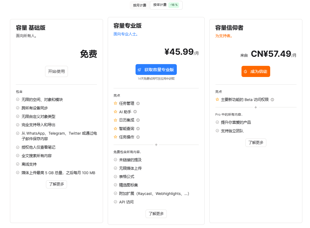 梳理了这么多云笔记的价格,可以发现,提供免费无线区块或者页面的云笔记,有Capacities、Amplenote以及Notion。让我非常吃惊的是,Anytype仅提供高达100MB的存储空间,实在是让我很意外,因为之前的政策是免费1G的空间。